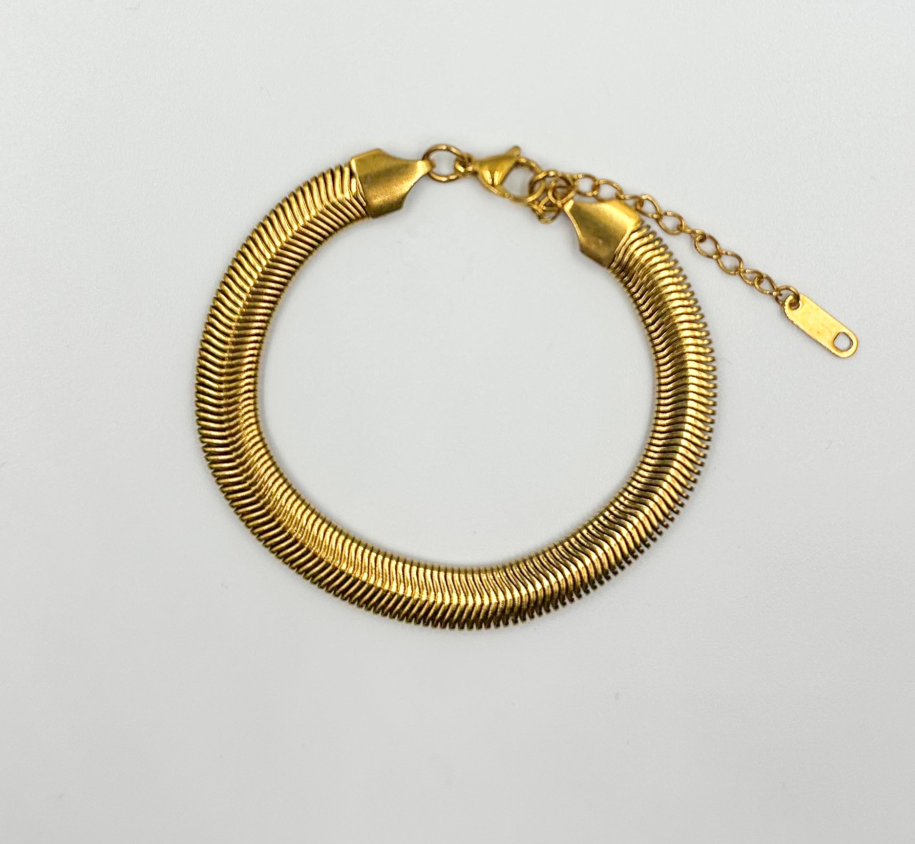 Met z’n platte snake design voelt deze armband als vloeibaar goud om je pols. Minimalistisch maar krachtig, perfect om solo te dragen of te layeren naast je watch of andere bracelets. Een piece dat net zo vloeiend is als jouw flow.