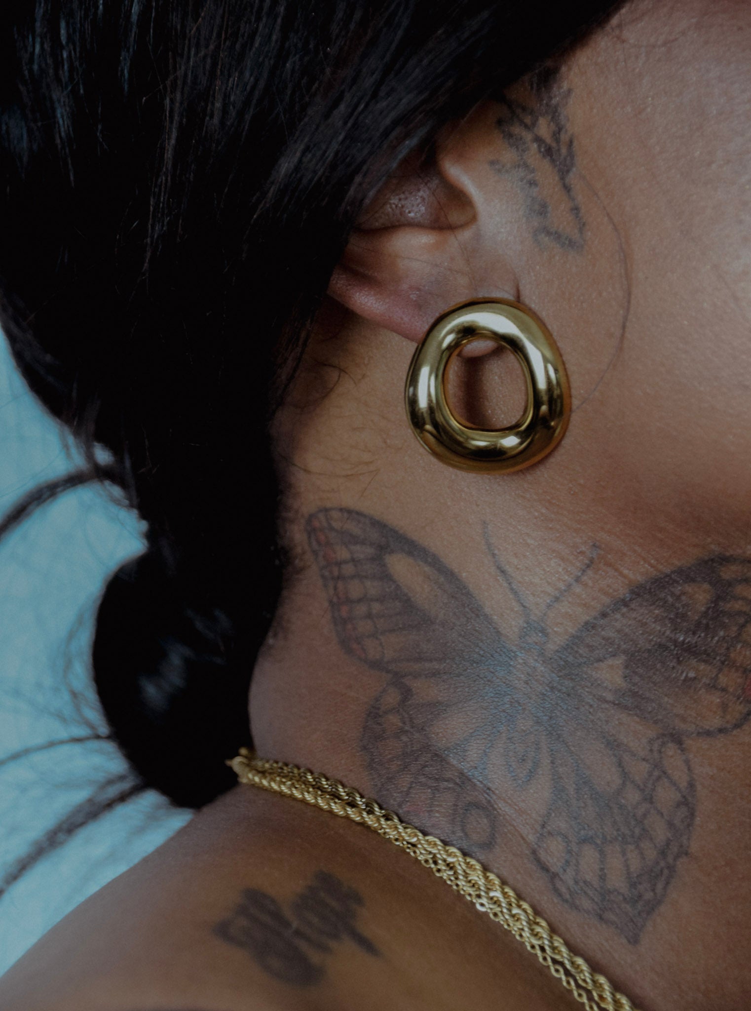 Met hun organische, open vorm en glanzende 18k gold plating brengen deze oorbellen een speelse maar krachtige vibe. Het design vangt het licht vanuit elke hoek, waardoor ze even opvallend zijn bij een streetwear fit als bij een night-out look.